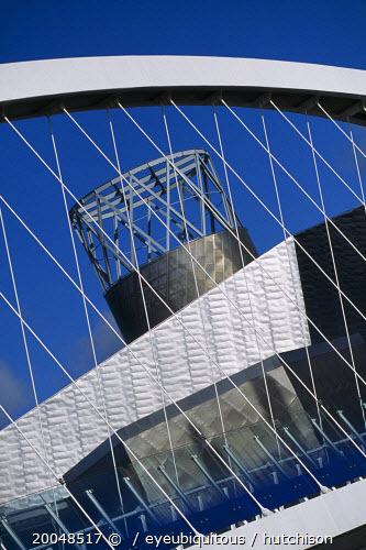 Exterior view of the Lowry Arts Centre seen through the footbridgeCenter