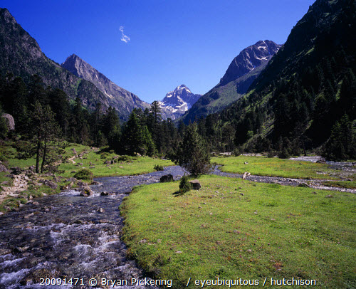 Vallee de Lutour. View south over lower valley with central snow covered peak of Pic de Labas 2927 m / 9586 ft south of Cauterets. Sparkling river and trees.