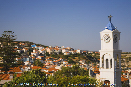 Pythagorio. Metamorfosis Sotiros Greek orthodox Church. Blue and white clock and bell tower with houses stretched across hillside beyond.AegeanGreek IslandsPithagorion Pythagorioncoast coastalseaSummerpackageholidayresortvacationtripdestinationDestinations ElladaEuropeanSouthern Europe Destination Destinations Religion Religious Salt Water Waves