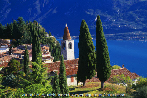 Pieve. View of tiled rooftops church and bell tower of village overlooking Western shore of Lake Garda. Cypress trees in foreground and mountain backdrop.