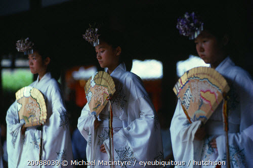 At Kasuga Shrine the shrine maidens miki perform one of the sacred kagura dances. Ancient dance form with words of the musical accompaniment written by former Emperor Hirohito and expressing his wish for world peace.