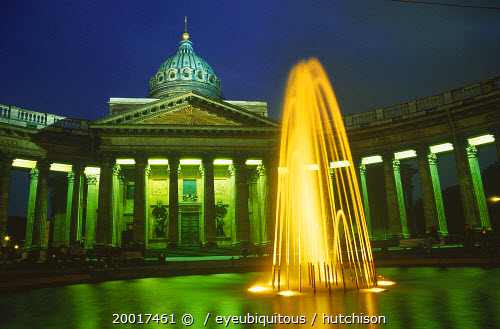 Kazan Cathedral exterior facade and fountain in foreground illuminated at night.