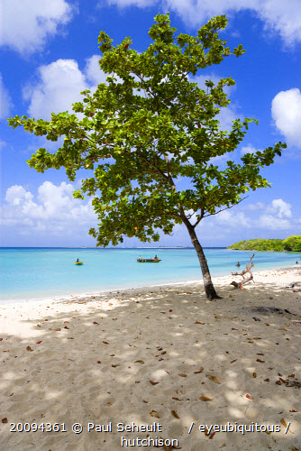The calm clear blue water breaking on Paradise Beach in LEsterre Bay with Sandy Island on the horizon and people in the water. A single tree gives shade on the beachCaribbean Grenadian Greneda West Indies Grenada Beaches Holidaymakers One individual Solo Lone Solitary Resort Scenic Seaside Shore Sunbather Tourism Tourist Tourists Travel