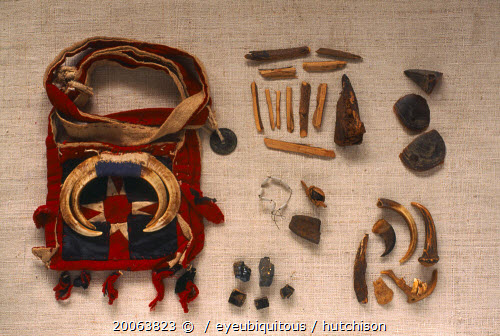 Yao Shamans bag decorated with wild boar tusks and contents of wood shells antlers and opium etc.