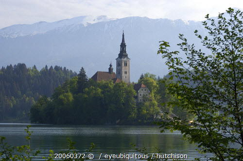 View over the lake toward Bled Island and tower of the Church of the Assumption