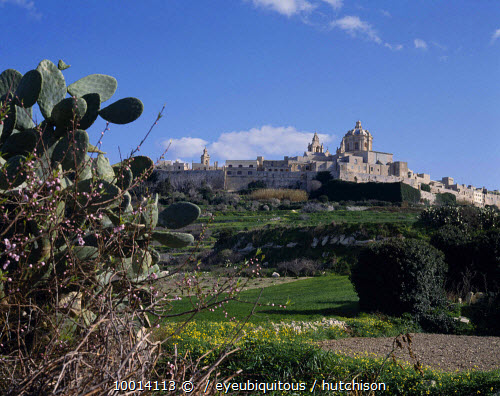 View past prickly pears over fields to the fortified hilltown and cathedral