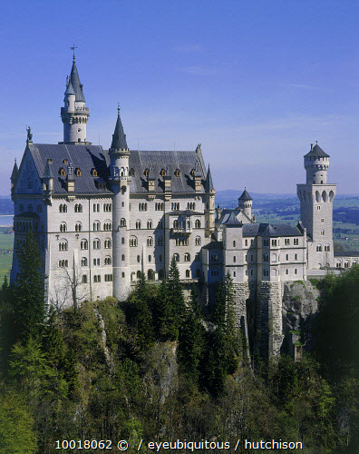 Neuschwanstein Castle of King Ludwig on a rocky hill amongst trees
