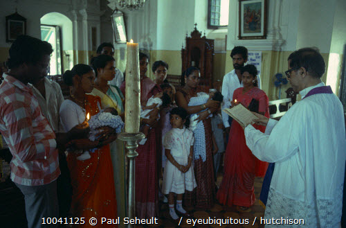 Church interior with priest conducting christening service three women standing holding babies with other guests and family members.3 Asia Asian Bharat Female Woman Girl Lady Inde Indian Intiya Kids Religion Religious