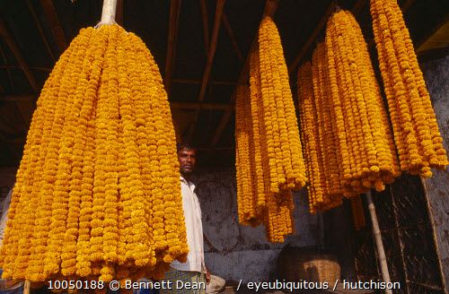 Man standing between orange flower garlands.Asia Asian Bharat Inde Indian Intiya Kolkata Calcutta Asia Asian Bharat Inde Indian Intiya Kolkata Calcutta