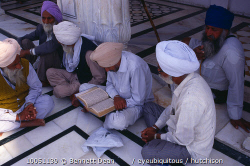 Group of Sikh men reading from holy book on black and white marble floor of the Golden Temple complex.Asia Asian Bharat Inde Indian Intiya Male Man Guy Religion Religion Religious Sihism Sikhs