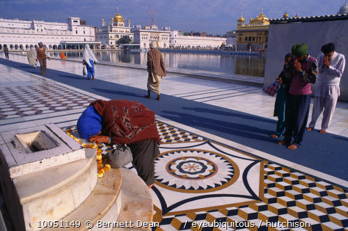 Barefooted pilgrims saying prayers at Golden Temple complex with offering of marigold flower garland lying on marble step.Asia Asian Bharat Inde Indian Intiya Religion Religious