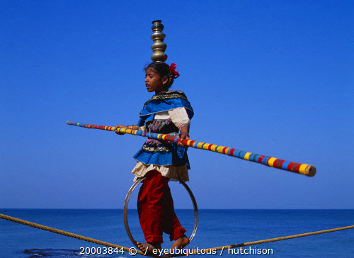 Young girl walks the tightrope while balancing silver pots on her head blue sky in background