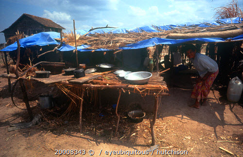 Phnom Prasat refugee camp. Refugees in makeshift shelter with table and cooking pots in the foreground.