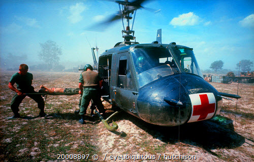 Dust off operation wounded soldier on a stretcher being lifted into helicopter ambulance. Cedar Falls