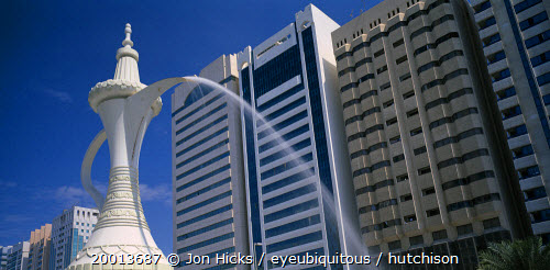 Al-Ittihad Square. Fountain of water falling from the spout of a sculpted Arabian coffeepot or dallah with high rise buildings behind. United Arab Emirates