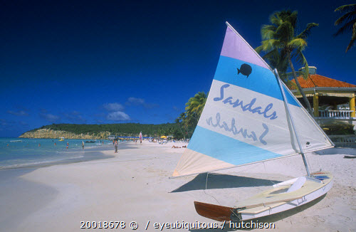 View along sandy beach lined with palms with boat in the foreground advertising Sandals hotel on its hull and sail. Building rooftop part seen behind.