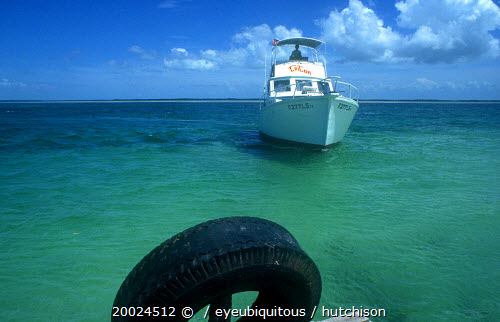 Deep sea fishing boat approaching jetty in clear light blue water