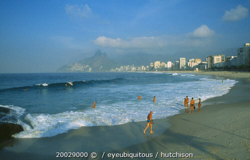 Ipanema Beach with bathers standing at the waters edge in early morning light with misty mountains in the distance.Brasil Brazil