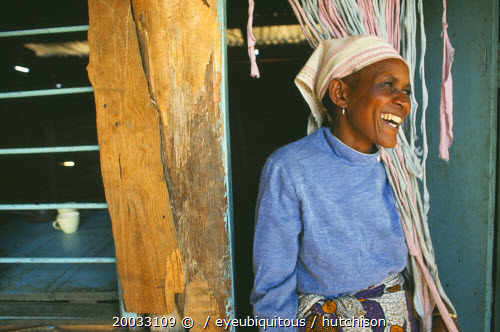 Kisongo Masai market outside Arusha. Portrait of Pauline owner of small teahouse laughing in doorway.
