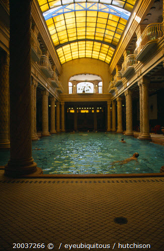 Gellert Baths. Interior with bathers in swimming pool lined with carved pillars and with domed glass roof above.