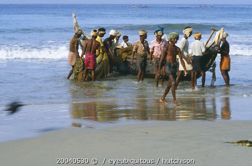 Fisherman dragging boat from the sea on to beach.Kerela Kovalum