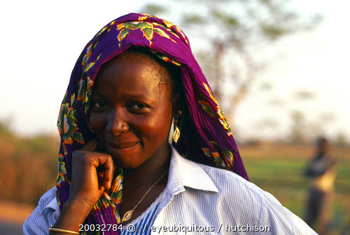 Portrait of smiling lady wearing purple headscarfe. Working in Paddy field.