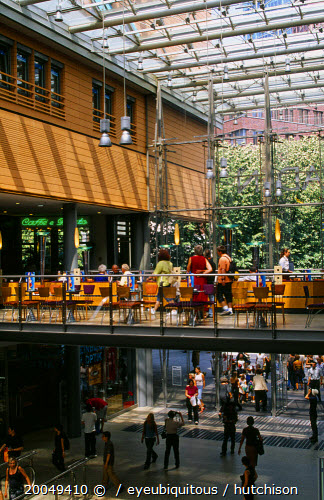 Potsdamer Platz. Cafe on mezzanine floor in Daimler City with shoppers below