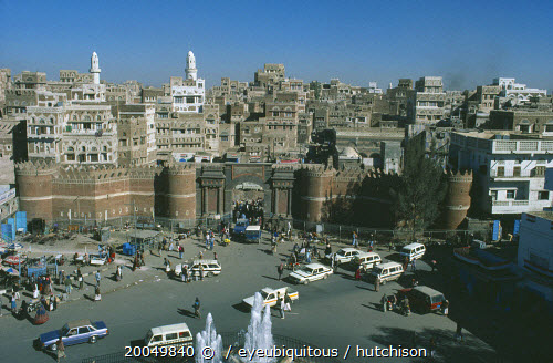 Aerial view overlooking the Old City with the city walls and entrance in the foreground with passing cars and pedestrians below