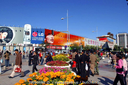 Busy commercial shopping area with flower pots in the foreground