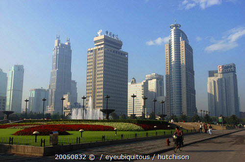 Modern city skyline with flowerbeds and fountain in the foreground with passing cyclist
