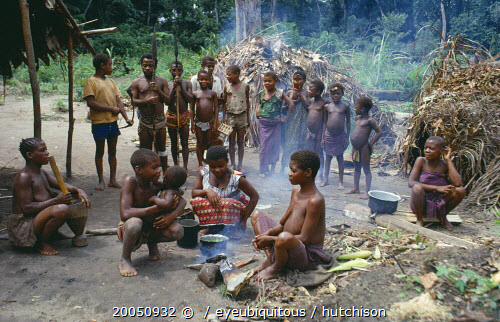 Pygmies. Extended family group.Zaire Congo Nomadic forest dwelling Twa people