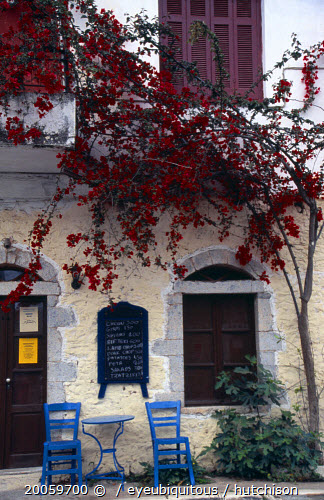 Kardamili. Taverna exterior with blue table and chairs on pavement and red flowering tree growing against the building.