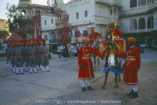 The City Palace complex. Shambhu Niwas Palace present residence of the Maharana or Rajput clan head. Courtyard with parade of private guards and horses.