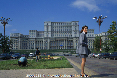 House of the Republic. Palace of former Communist president Nicholae Ceausescu. Exterior facade with young woman standing in foreground.