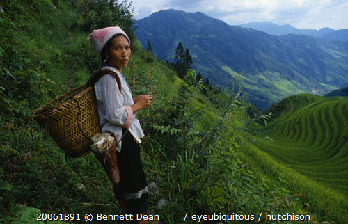 Woman on steep pathway above rice terraces carrying woven basket on her back.Asia Asian Chinese Chungkuo Jhonggu— Zhonggu— Asia Asian Chinese Chungkuo Jhonggu— Zhonggu—