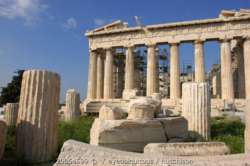 Acropolis. View of the ruined Parthenon with smaller sections of columns in the foreground