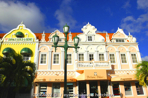 Oranjestad. Colourful colonial style facades of perfumerie and jewellery shops