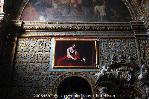 Interior of St Johns Cathedral with hanging artwork and frescoe