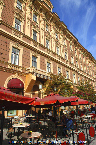 Street cafe with tables and chairs under large red umbrellas