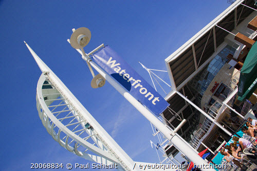 The Spinnaker Tower the tallest public viewing platforn in the UK at 170 metres on Gunwharf Quay with people sitting at tables outside waterfront restaurants