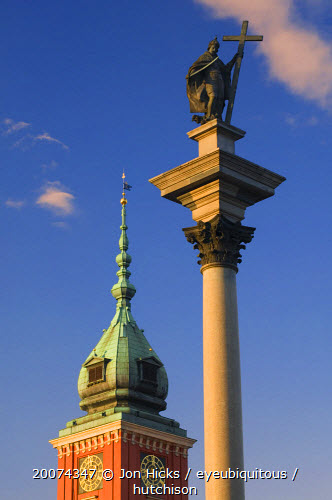 Detail of the Monument to Sigismund III in Plac Zamkowy Castle Square with the Royal Castle behind with clocks on the tower.TourismTravelHolidaysEastern Europe