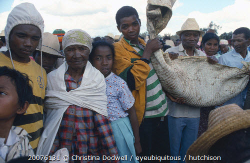 Merina bone turning ceremony or famadihana in which the remains of a relative are exhumed celebrated and danced with before being wrapped in clean shroud and reburied.