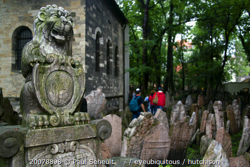 The tombstone of the Jewish nobleman Hendela Bassevi outside the Neo-Romanesque Ceremonial hall amongst densely packed gravestones in the Jewish Cemetary