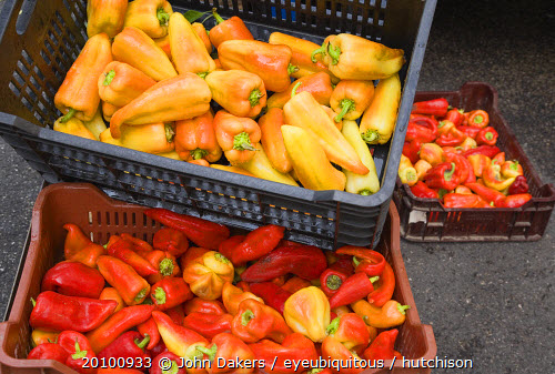 Hungary, Pest County, Budapest, crates of red and orange Capsicum annuum, bell pepper or chili pepper on fresh produce stall at the rail terminus Budapest Nyugati palyaudvar. When dried, ground to make paprika, the word paprika is often used to refer to the bell peppers themselves.