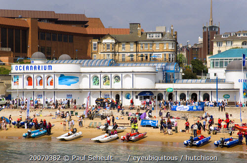The West Beach from The Pier with the BICC Bournemouth International Conference Centre and Oceanarium behind. Contestants for Zapcat inflatable speedboat races watch the races from the beach