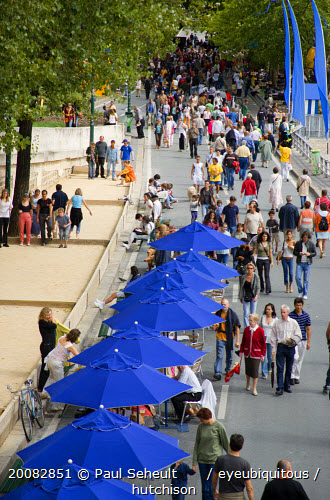 The Paris Plage urban beach. People strolling between the River Seine and people playing boules or petanque divided by a line of tables under umbrellas along the Voie Georges Pompidou usually a busy road now closed to traffic opposite the Ile de la Cite