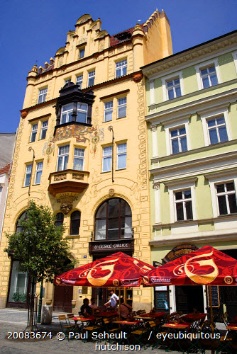 Old Town. Tourists sitting at tables under umbrellas outside a cafe with a painted facade in Ovocny trh the fruit marketPraha Ceska Eastern Europe European Bar Bistro Restaurant