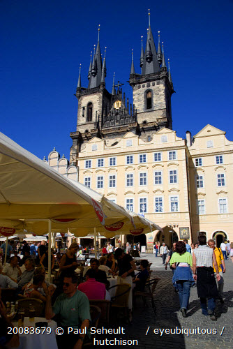 The Old Town Square with the Church of Our Lady before Tyn. Tourists sit at tables under umbrellas outside cafes and restaurants whilst others stroll in the squarePraha Ceska Eastern Europe European Religion Religious