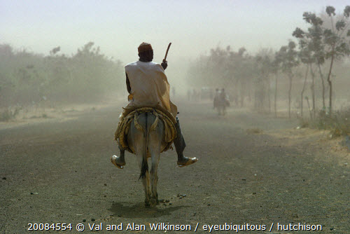 Desertification. Man riding donkey through dust storm.African Ecology Entorno Environmental Environnement Green Issues Nigerian Western Africa Male Men Guy Scenic Male Man Guy One individual Solo Lone Solitary