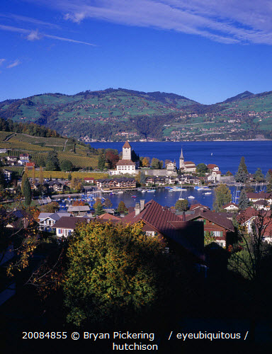 View across trees and roof tops towards Spiez Village and the south bank of Lake Thunersee with yachts on the waterEuropean Schweiz Suisse Svizzera Swiss Western Europe Scenic